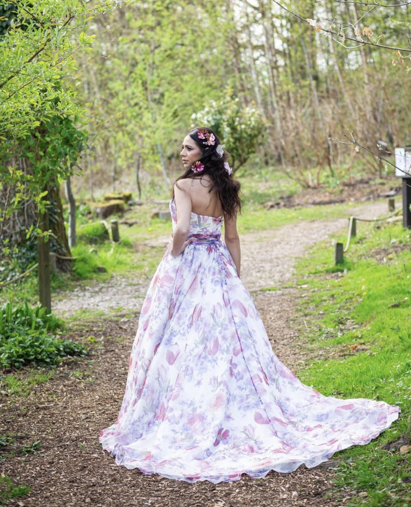 "Bloom" strapless gown with pink-and-purple floral print by Charlotte Balbier. ONE ONLY AVAILABLE S16