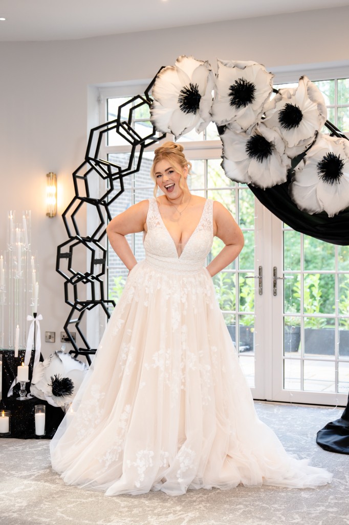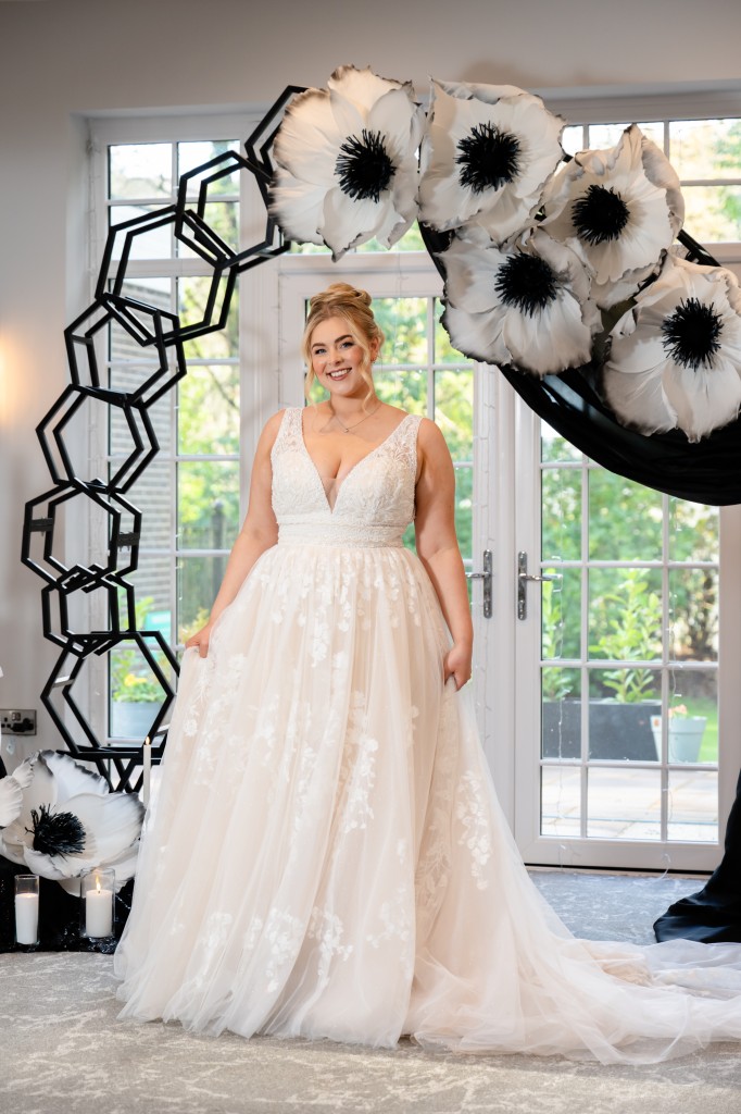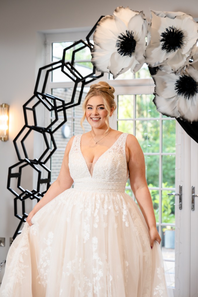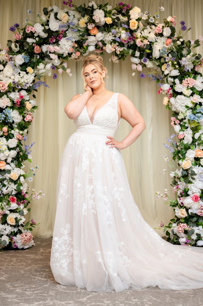 A true romantic’s dream. The bodice is crafted from layered beaded lace appliqués. Layers of soft tulle, sparkle layers and beaded lace complete this dreamy skirt. Her plunging neckline is finished with a diamante trim that continues into the thick strap, striking the perfect balance between simplicity and high impact. With a hidden zip to complete this goddess-inspired dress. Sample available uk18 blush