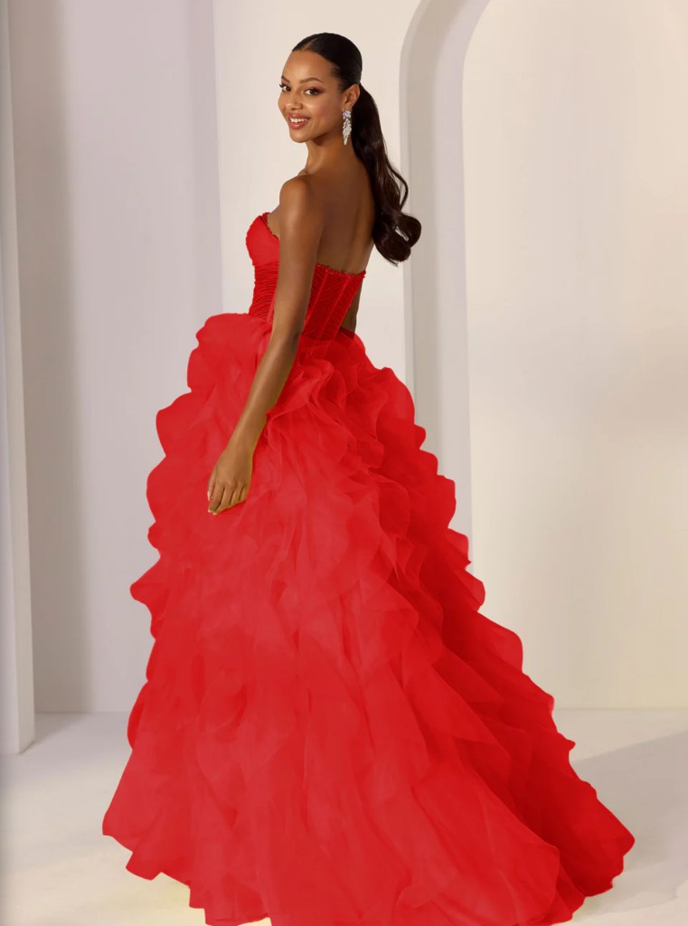 For when you need a main character moment. This organza A-line party dress blends feminine detail with undeniable edge. The strapless sweetheart neckline shimmers with peek-a-boo beading, while the ruched, corset bodice sculpts your silhouette. Finished with a ruffled skirt that moves with you, it’s a statement in confidence, elegance, and allure. ( sample available to try in store in Poppy red UK12)